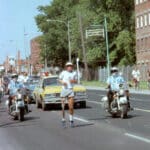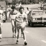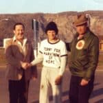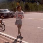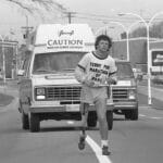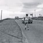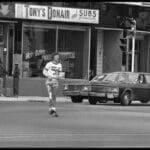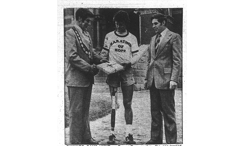 At 3pm Terry meets Mayor Dorothy Wyatt, has a brief ceremony and begins his Marathon of Hope with a 12-mile run. “I had a police escort out of the city and many people followed me in cars. The mayor ran a few steps with me. Along the way everyone was honking and waving.”