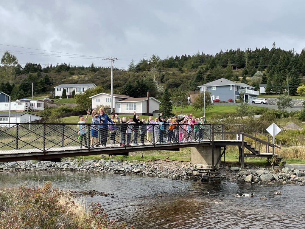 Heureux de prendre la pose, ces élèves sont de l’école St. Francis Assisi, à Outer Cove, là où Terry a rempli sa bouteille d’eau de l’océan Atlantique.