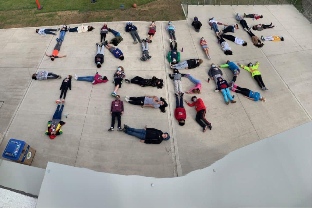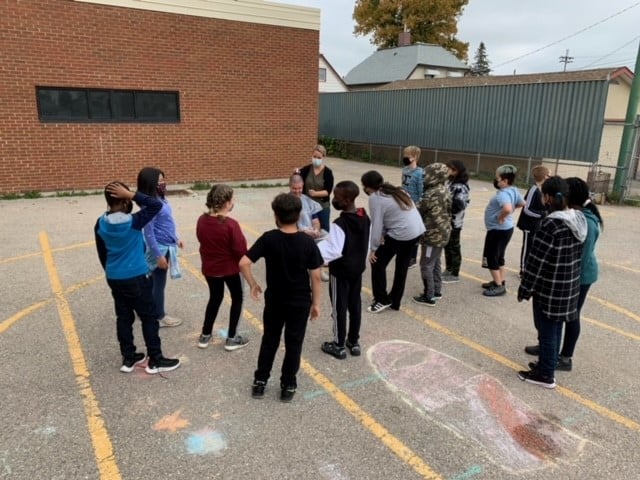 Les élèves de 4e année de l’école Branlyn Community, inspirés par la bordure perlée métisse, ont formé le symbole métis d’infinité après leur Journée Terry Fox et se sont pris en photo.