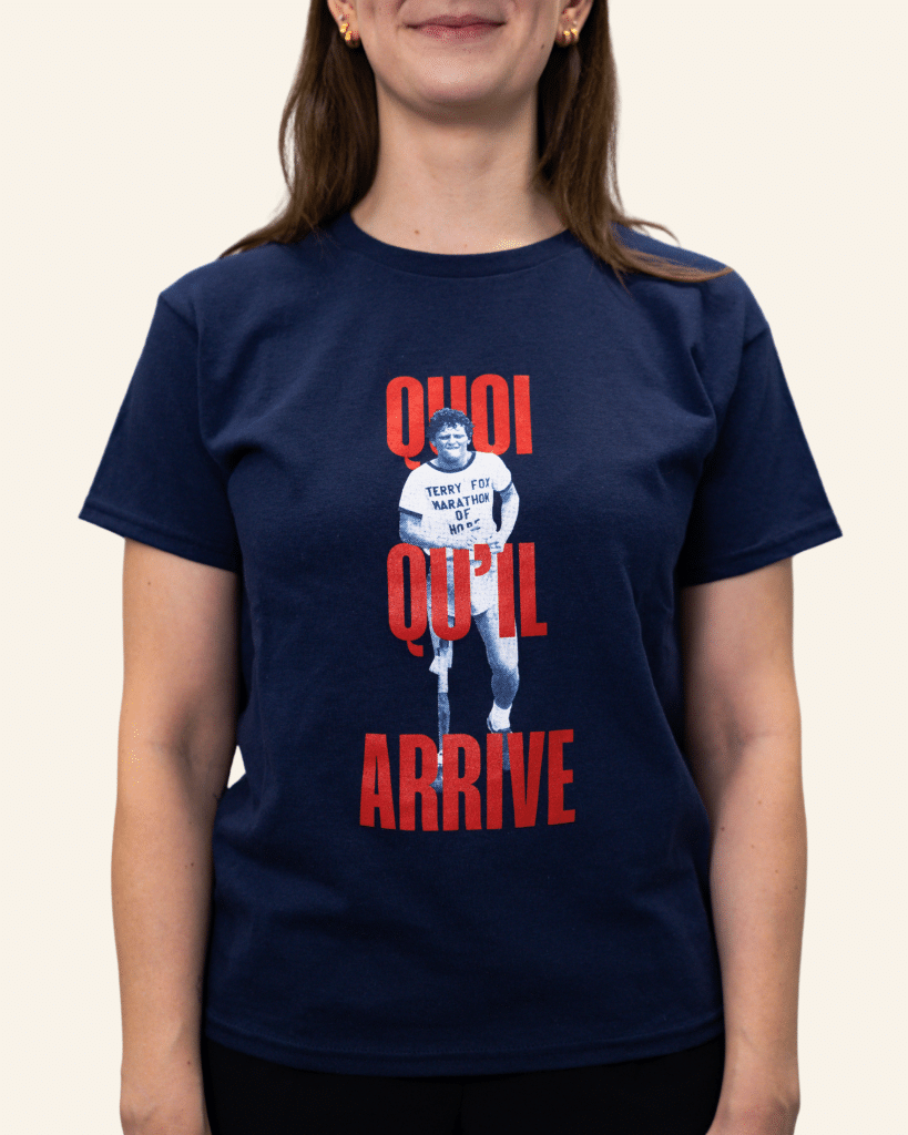 La Fondation Terry Fox fait à nouveau équipe avec le populaire acteur canadien Ryan Reynolds pour le lancement de son t-shirt annuel de La Course Terry Fox offert en série limitée. Cette année, le vêtement affiche les mots de Terry, #QuoiQuilArrive, en hommage à la détermination inébranlable dont il a fait preuve pendant son emblématique Marathon de l’espoir de 1980, et ce, peu importe les défis et les circonstances qui se présentaient à lui.