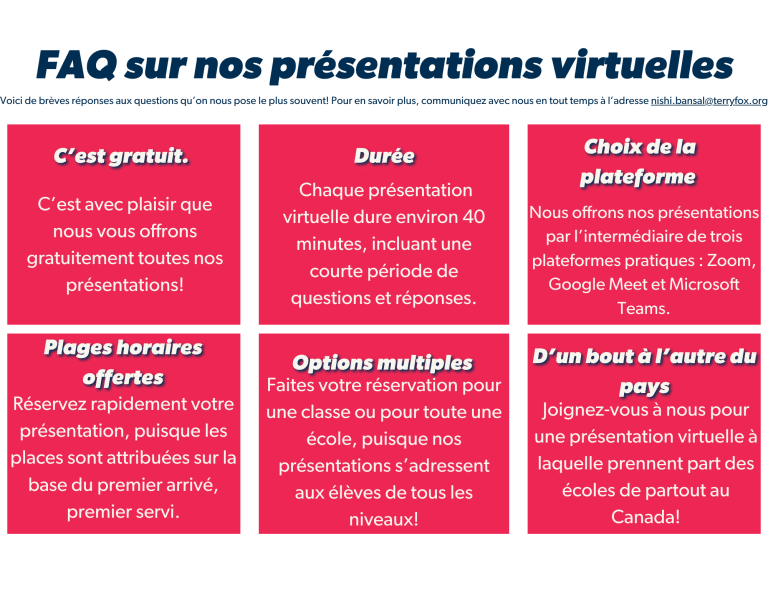 Merci à tous ceux et celles qui ont pris part à nos présentations virtuelles cette année! C’est avec un immense plaisir que nous vous annonçons que 160 000 élèves se sont joints à nous pour partager et célébrer ensemble l’inspirante histoire de Terry Fox et de son héritage qui se perpétue.